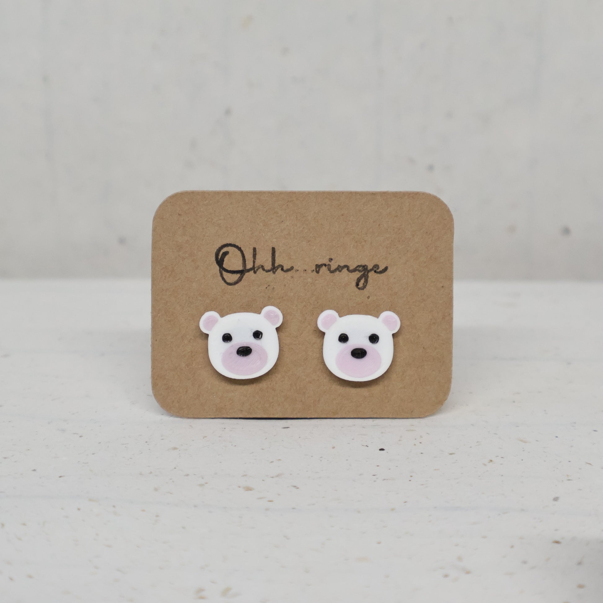 Pendientes impresos en 3D con filamento biodegradable (PLA), perno de plástico y cierre de silicona.
