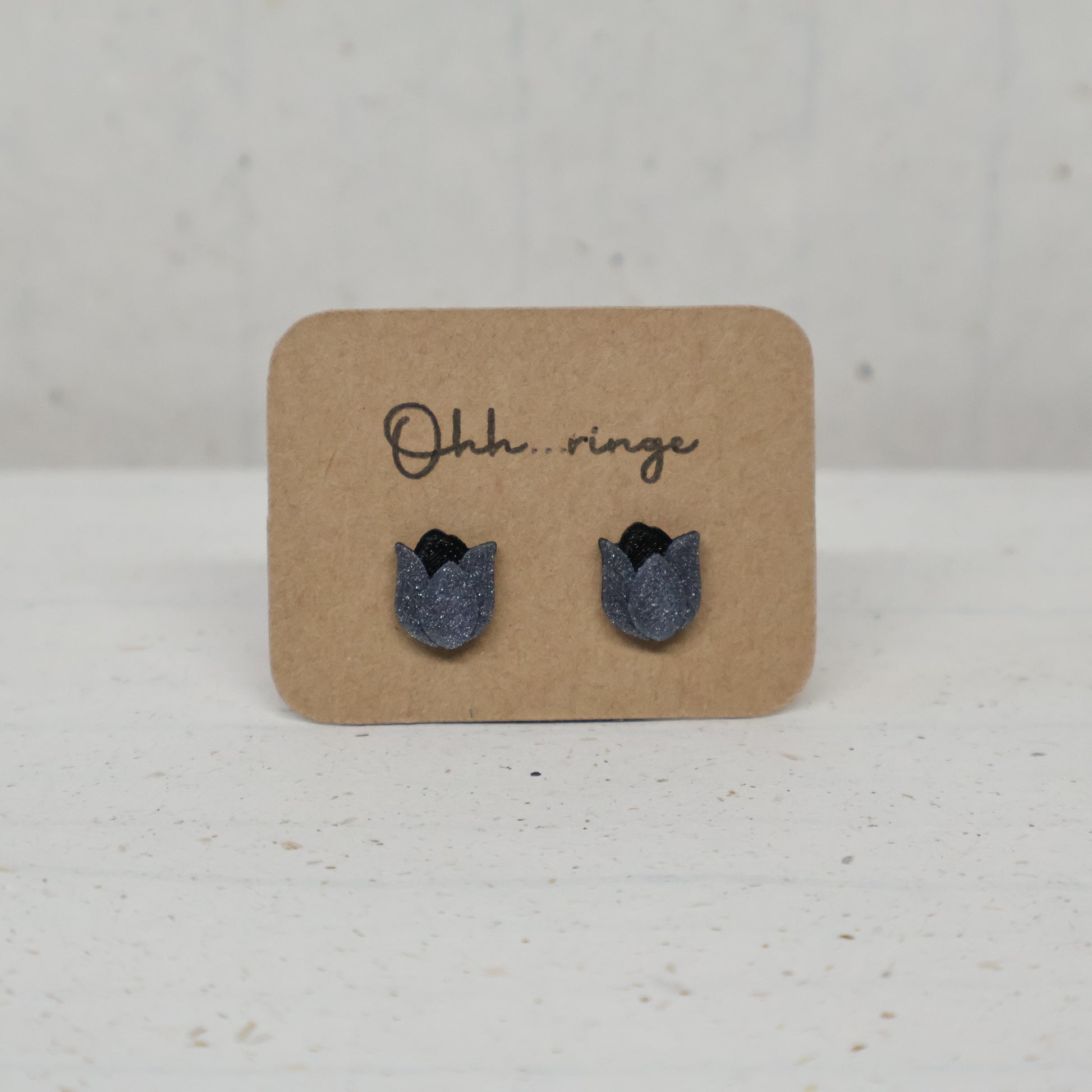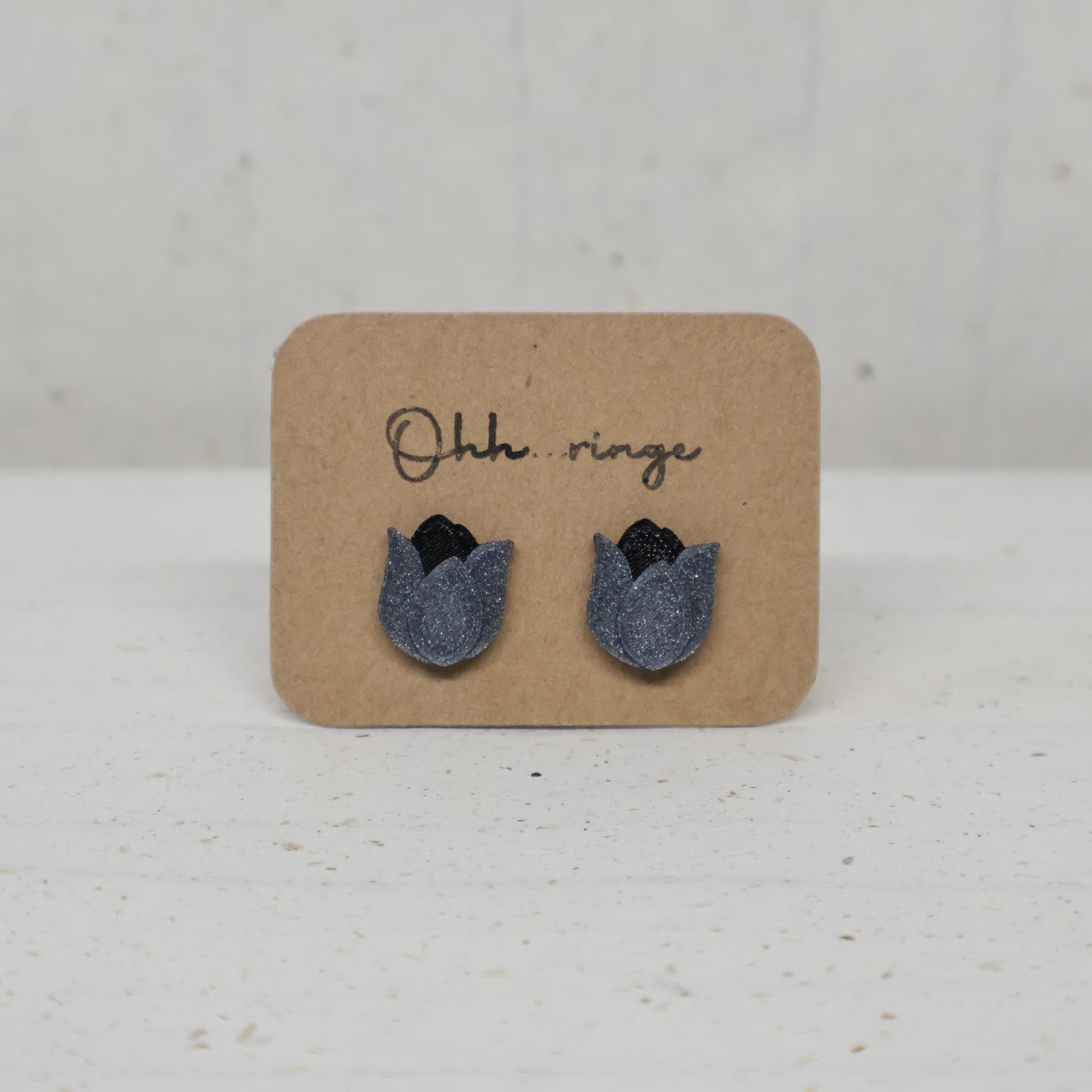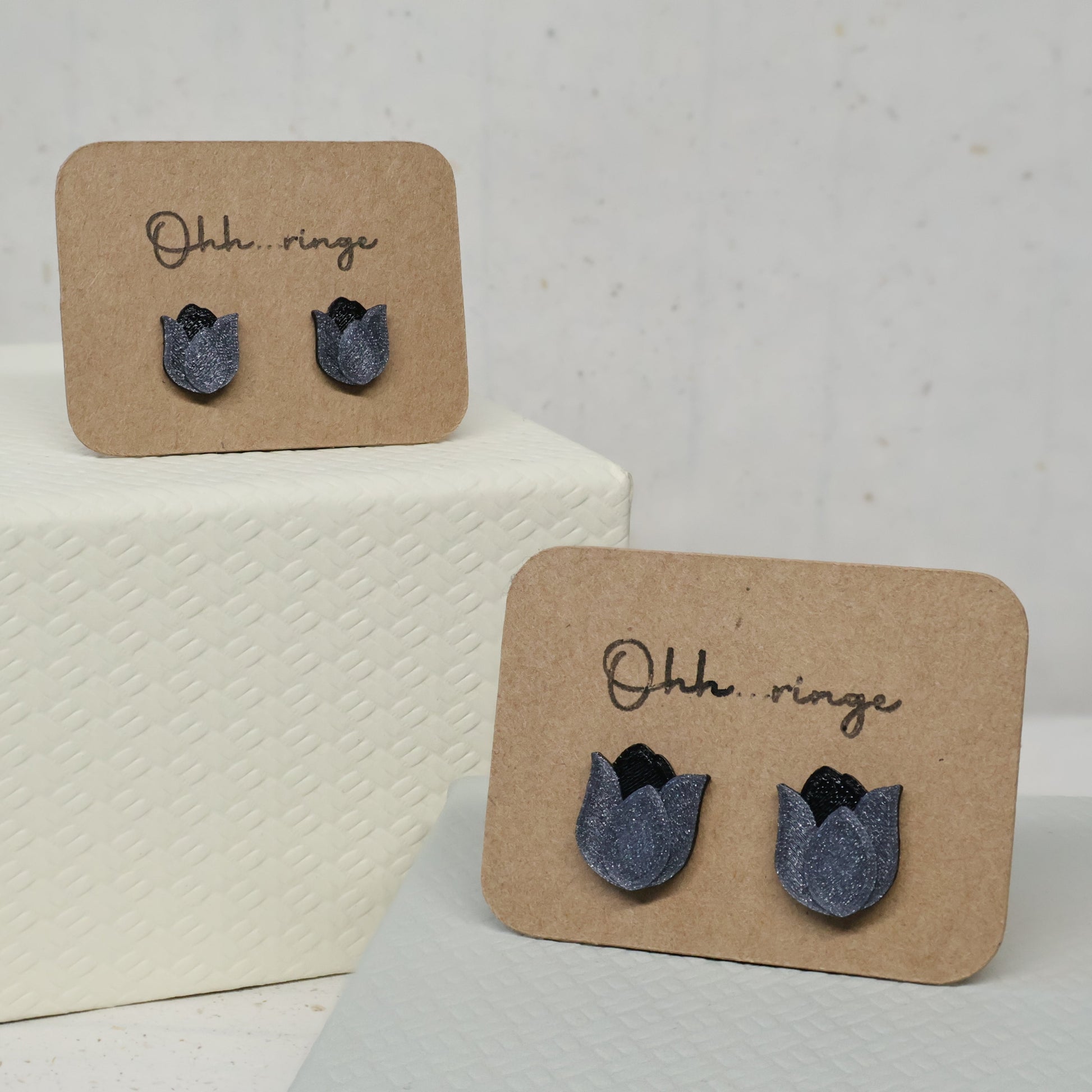 Pendientes impresos en 3D con filamento biodegradable (PLA), perno de plástico y cierre de silicona.